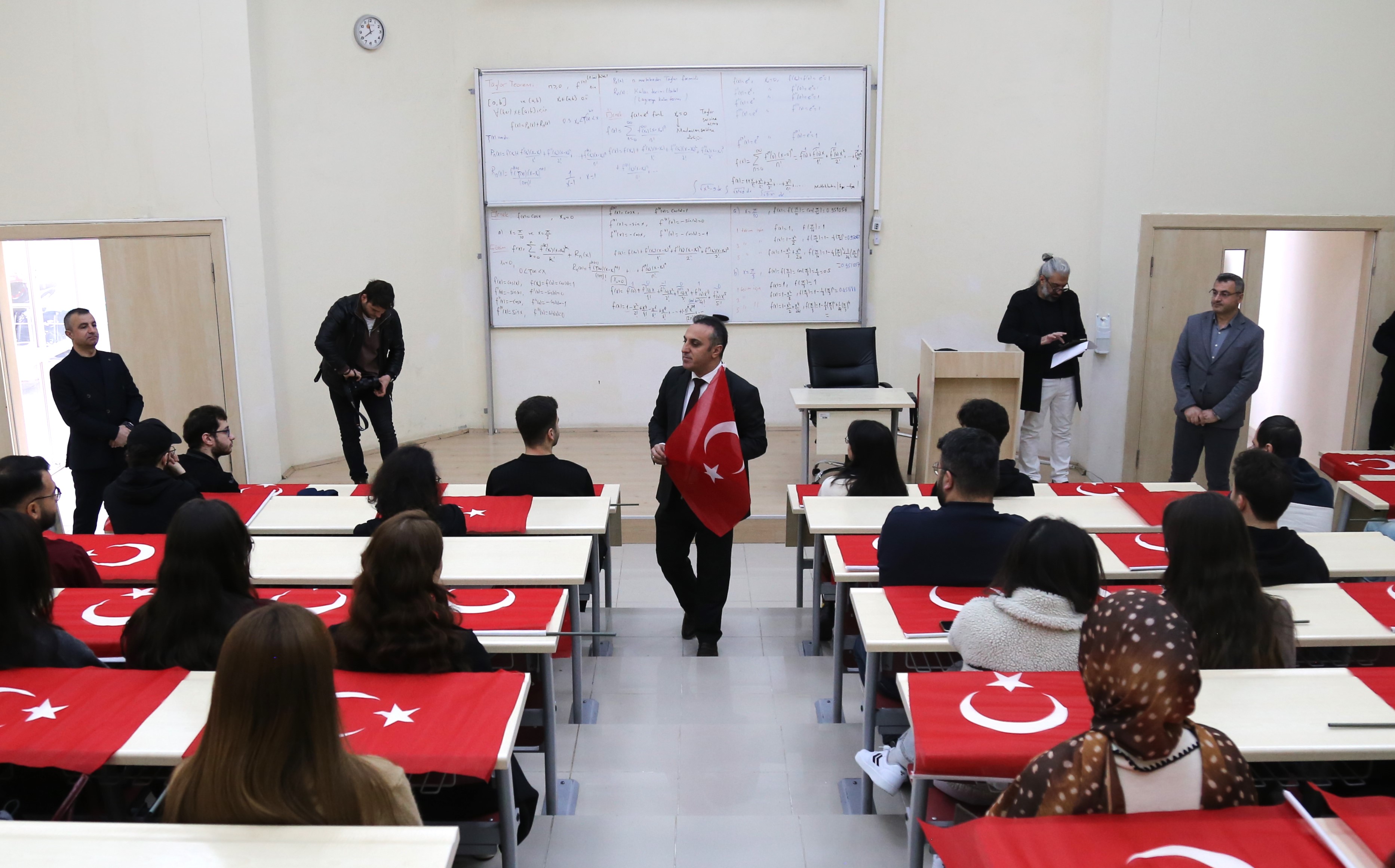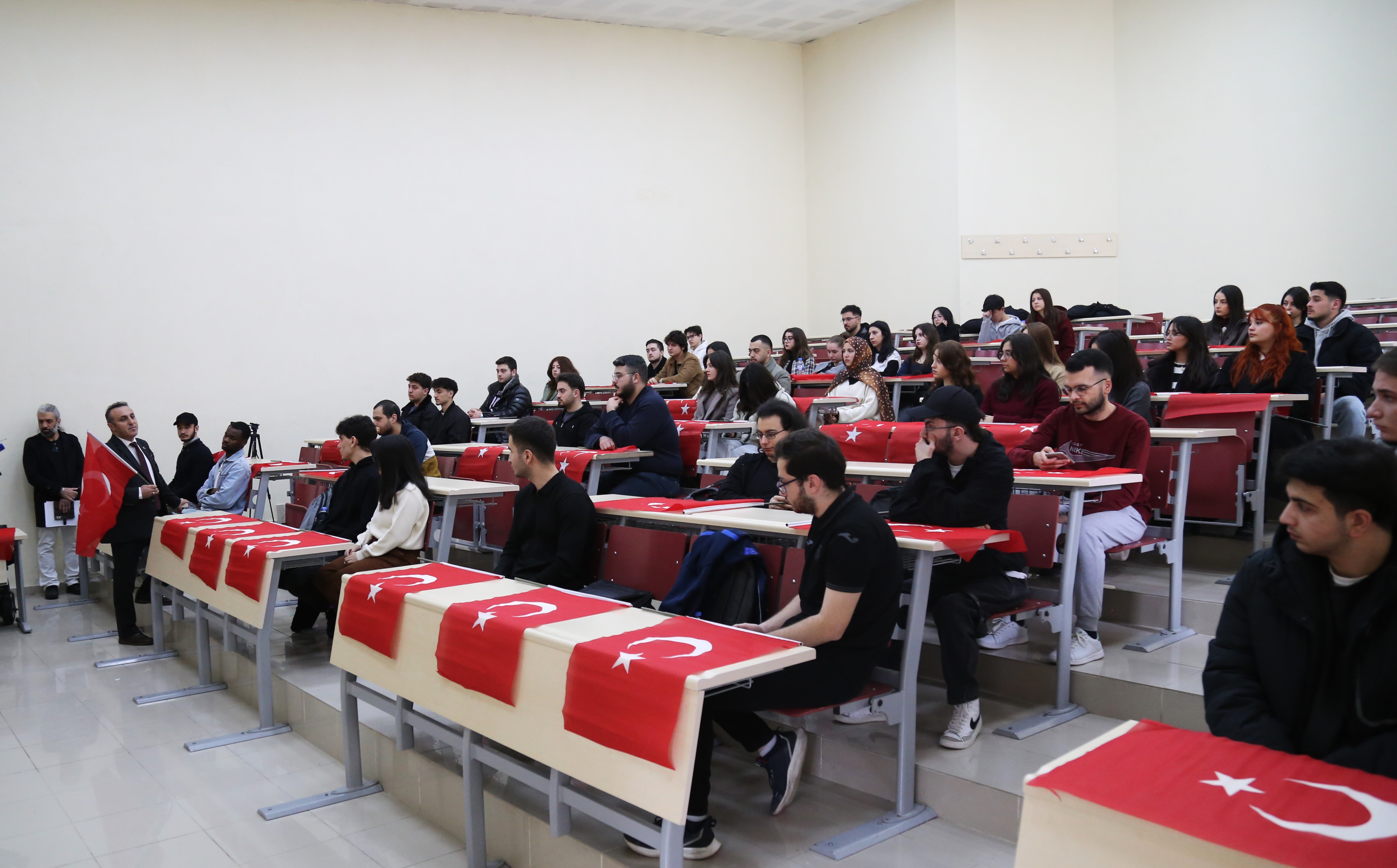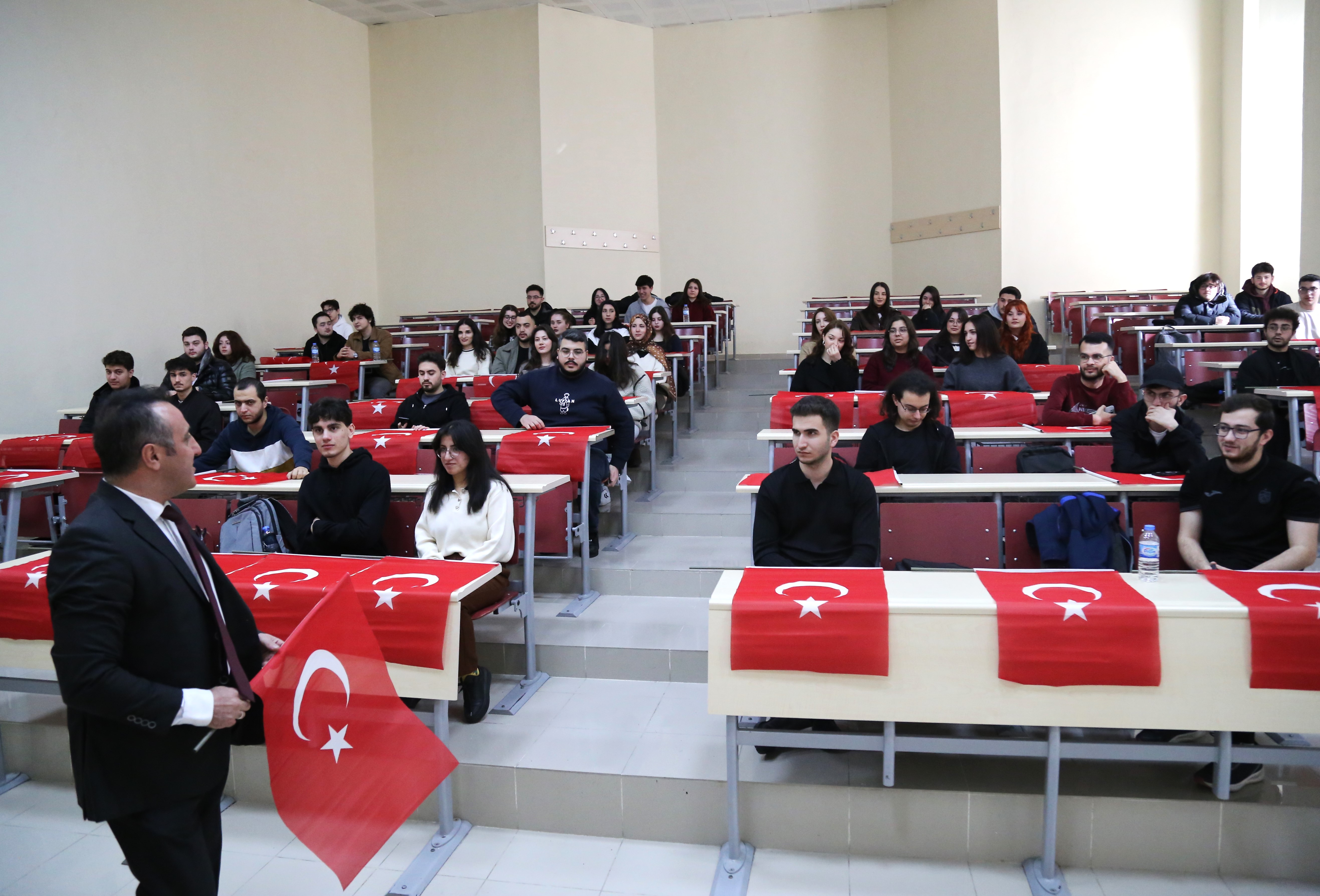Uygulamanın gerçekleştirildiği ders saatinde üniversitemiz Mühendislik ve Doğa Bilimleri Fakültesi’nde düzenlenen etkinliğe katılan Rektörümüz Prof. Dr. Oktay Yıldız, öğrencilerle bir araya gelerek Türk Bayrağı’nın taşıdığı anlam ve millî değerlerimiz açısından önemine dikkat çekti. Dersin başlangıcında öğrencilerle kısa bir değerlendirme yapan rektörümüz, bayrağın yalnızca bir devlet simgesi değil; tarih boyunca verilen mücadelenin, ortak hafızanın ve bağımsızlık iradesinin en güçlü ifadesi olduğunu vurguladı. Üniversite ortamının bilgi üretmenin yanı sıra değerleri yaşatmak ve geleceğe taşımak bakımından da önemli bir sorumluluk taşıdığını belirten Prof. Dr. Yıldız, bahar yarıyılına bu tema ile başlamayı özellikle önemsediklerini ifade etti.
