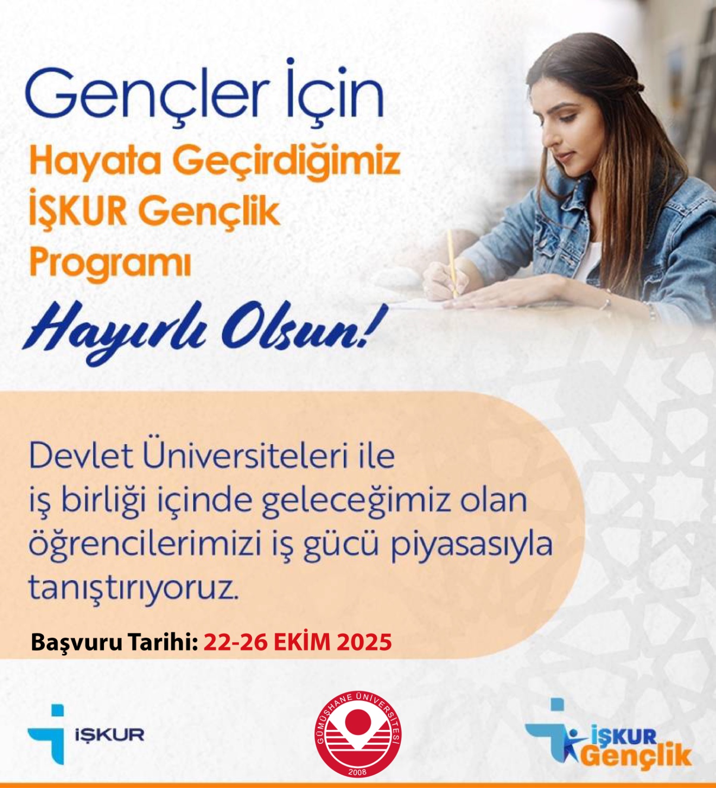 Başvuru Tarihi: İŞKUR Gençlik Programına başvurular 22.10.2025 – 26.10.2025 tarihleri arasında alınacak olup, öğrencilerimiz başvurularını aşağıdaki internet adresleri ve iletişim hattı üzerinden yapabileceklerdir. Öğrencilerimiz öğrenim gördüğü Fakültelere ve İlçe MYO lara başvuru yapacaktır. Merkez Myo lar ve Lisansüstü Eğt. Enstitüsü Genel Sekreterlik işyerine başvuru yapacaktır. Gümüşhane İli seçilerek kendinize uygun programa başvuru yapmanız gerekmektedir.