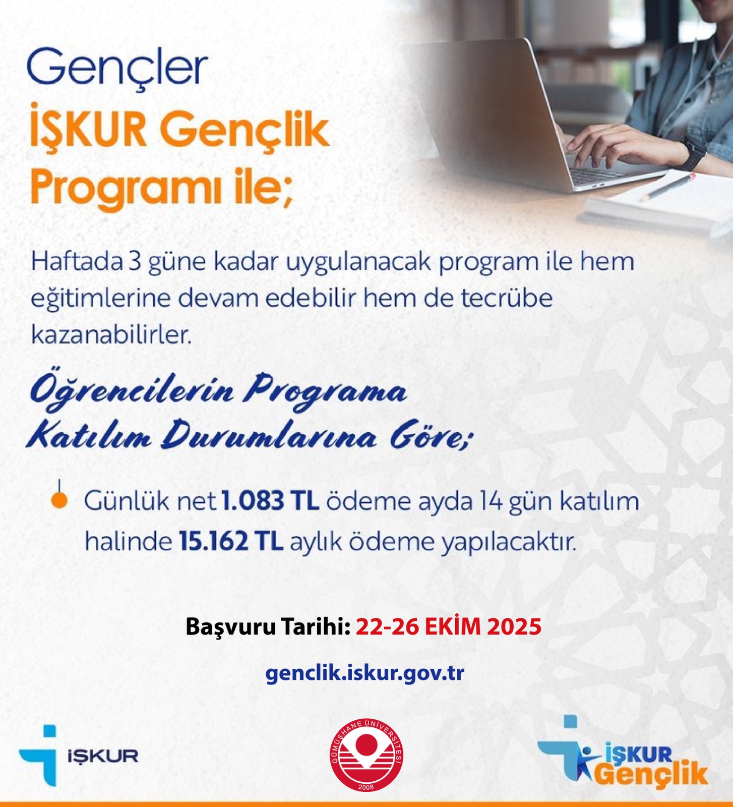 Üniversite öğrencilerinin istihdam edilebilirliğini artıracak bilgi, beceri, çalışma alışkanlığı ve disiplinini kazandırmak üzere Türkiye İş Kurumu (İŞKUR) tarafından devlet üniversiteleriyle iş birliği yapılarak düzenlenen ve bir aktif işgücü programı olan İŞKUR Gençlik Programı başlıyor.