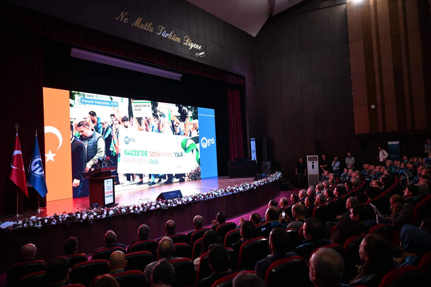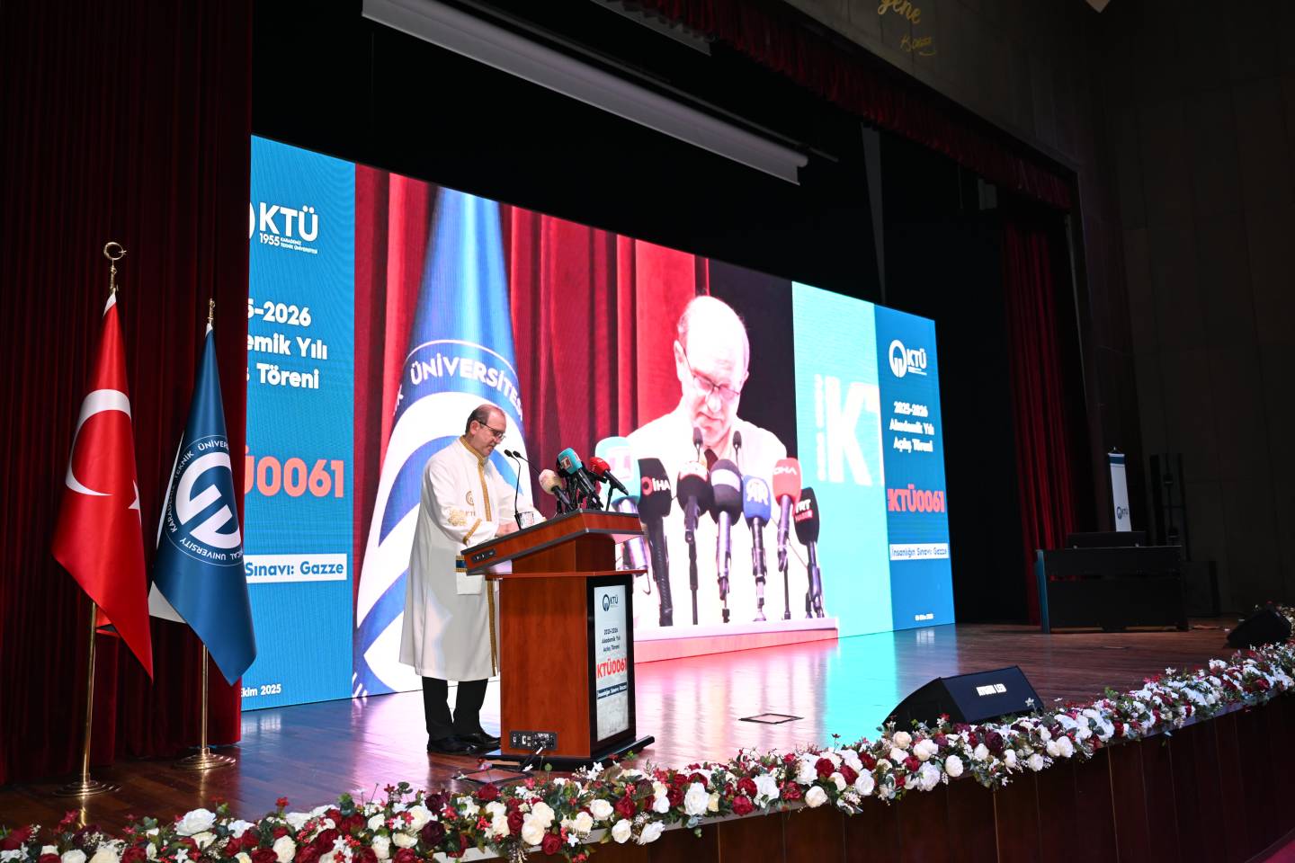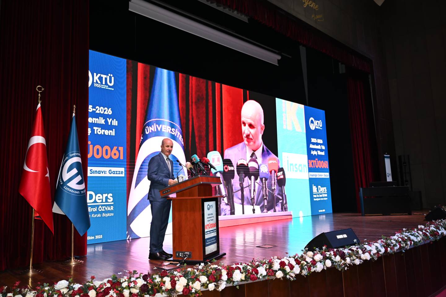 Törende konuşan KTÜ Rektörü Prof. Dr. Hamdullah Çuvalcı, üniversitenin 63 yıllık geçmişine değinerek, “KTÜ, Türkiye’nin 4. üniversitesi olmanın getirdiği tarihi sorumlulukla, bilimi ve vicdanı merkeze alan bir anlayışı sürdürmektedir.” dedi. Rektör Çuvalcı, Gazze’de yaşanan insanlık trajedisine dikkat çekerek, “Küresel Sumud Filosu, insanlığın vicdanının sembolüdür. Bu filoya yapılan saldırı, insanlık değerlerine yapılmıştır.” ifadelerini kullandı.