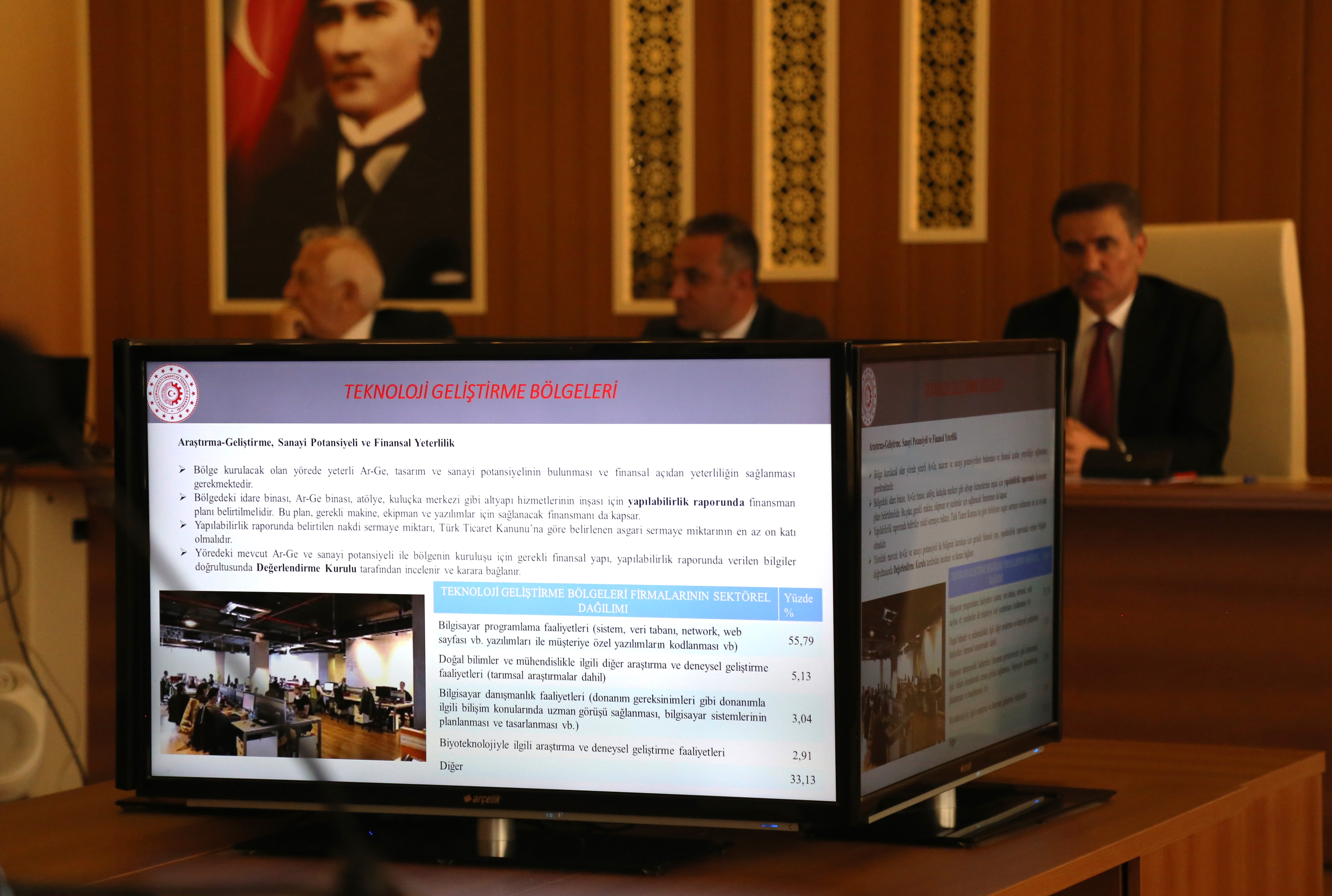 Sanayi ve Teknoloji İl Müdürü Tarık Tarkan Kocagöz ve Rektörümüz Prof. Dr. Oktay Yıldız’ın sunum yaptığı toplantının ana gündeminin Teknoloji Geliştirme Bölgesi olduğunu ifade eden Vali Baruş; “Teknoloji geliştirme bölgelerinin amacı, üniversite sanayi işbirliğini sağlayarak bilimsel araştırma ve geliştirme faaliyetlerinin ekonomiye yansıtılmasını temin etmek. Özellikle hocalarımızın yapmış olduğu çalışmalar neticesinde geliştirdikleri teknik ve teknolojileri, bilimsel birikimleri ilimiz ekonomisine faydalı hale getirmek. Bunun temel amacı bu. Türkiye'de 2025 yılı itibariyle 106 adet teknoloji geliştirme bölgesi var. Bunlardan 91’i hala faaliyetlerini yürütüyor. 15’inin ise altyapı çalışmaları devam etmekte. Gümüşhane’de de teknoloji geliştirme bölgesinin birçok olumlu neticeye yol açacağını öngörüyoruz. Hem üniversitemizin araştırma geliştirme faaliyetlerinin artmasına hem de ilimizde faaliyet göstermek isteyen girişimcilerin bu teknoloji geliştirme bölgesinde ortaya çıkabilen buluşlardan ve yeni üretim tekniklerinden istifade ederek ekonomimize daha fazla katkı sağlayacağına inanıyoruz” dedi.