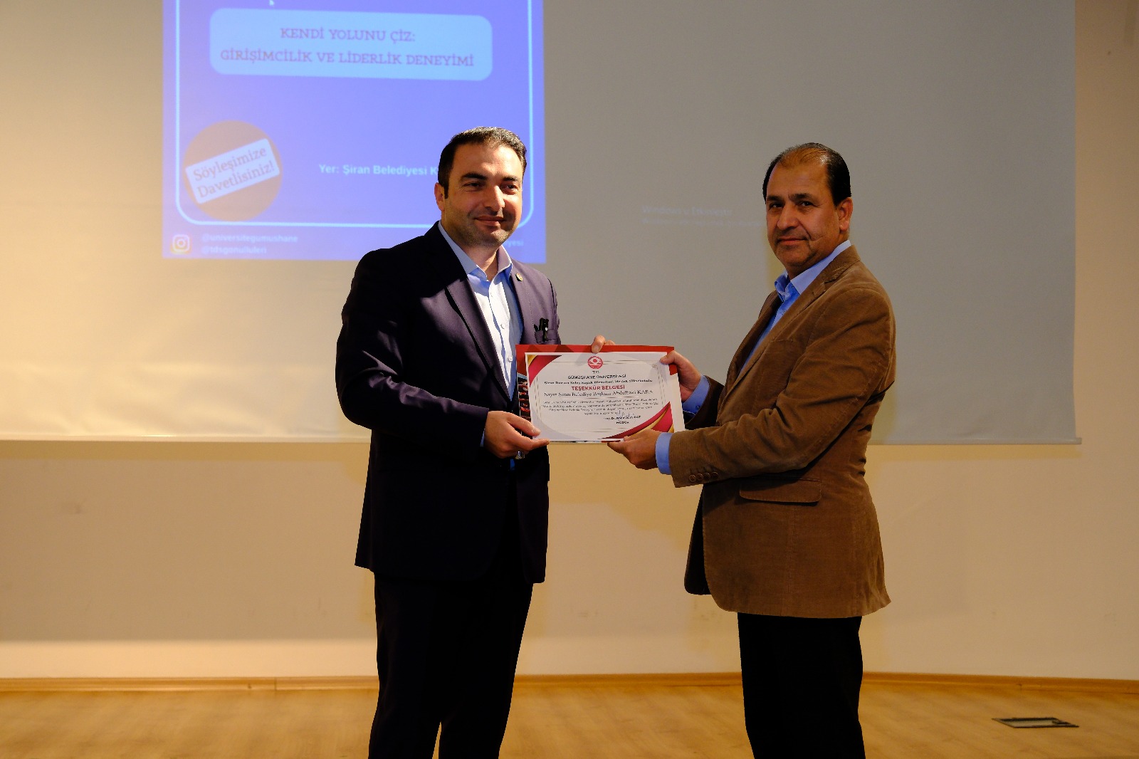 Etkinlikle ilgili değerlendirmelerde bulunan Rektörümüz Prof. Dr. Oktay YILDIZ; “Üniversitemiz adına öğrencilerimize ilham veren, onların ufkunu geliştiren, azim, vizyon ve kararlılıkla kendi yolunu çizmiş bir bireyin deneyimlerini paylaşması bizler için çok değerli. Bu tür etkinliklerin bireysel ve toplumsal düzeyde fark yaratacağına inanıyorum. Bu vesileyle de Şiran Belediye Başkanımız Sayın Abdulbaki KARA’ya teşekkür ediyor, emeği geçen tüm akademik ve idari personelimizi kutluyorum.” ifadelerini kullandı.
